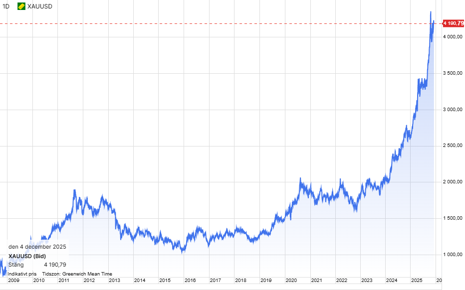 Med den oerhört solida basen ser jag faktiskt framför mig att vi potentiellt har flera goda år kvar, men att den takten priset nu stiger i torde vara ohållbar. Vi kommer säkert få bakslag, konsolideringar, prisfall och tvekan. Ganska mycket av den varan skulle jag tro vad det lider. Jag gissar att redan 2026 kan bli relativt stökigt och kanske tråkigt för guldpriset.